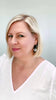 A modern expression of minimalism, these hand-embroidered hoop earrings from the Kuro Collection feature bold black spots and stripes paired with soft pale blue satin stitch.