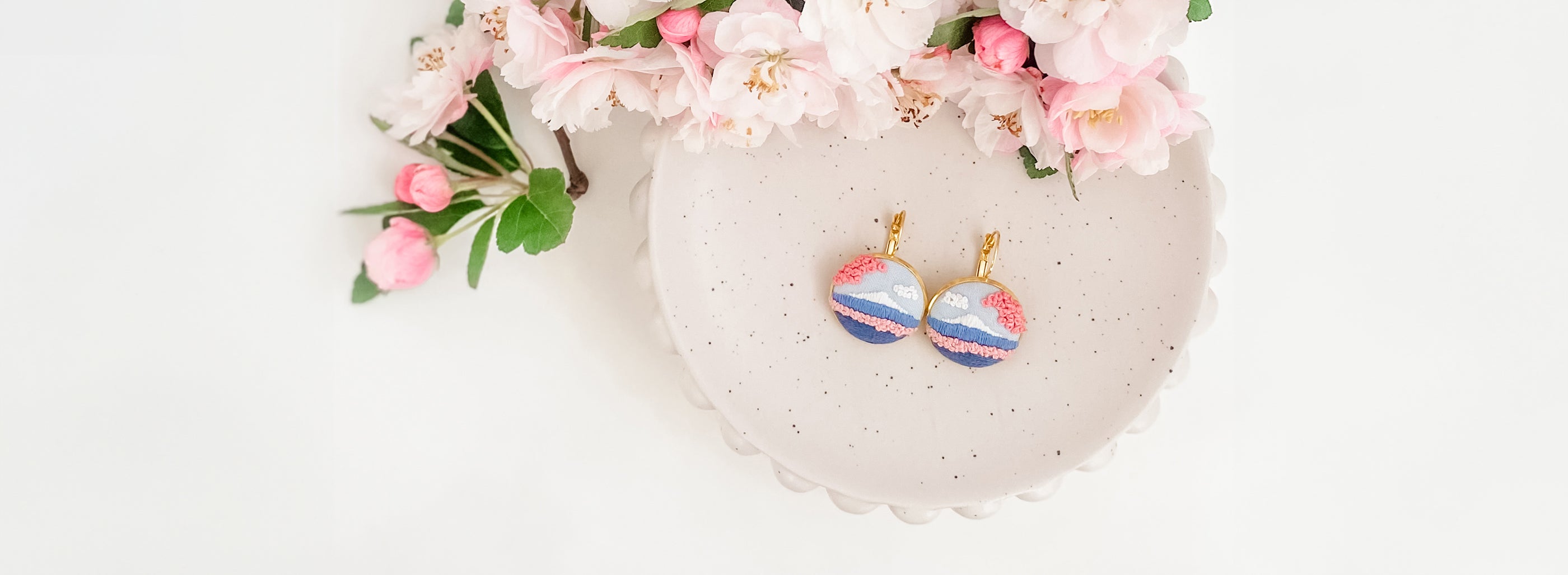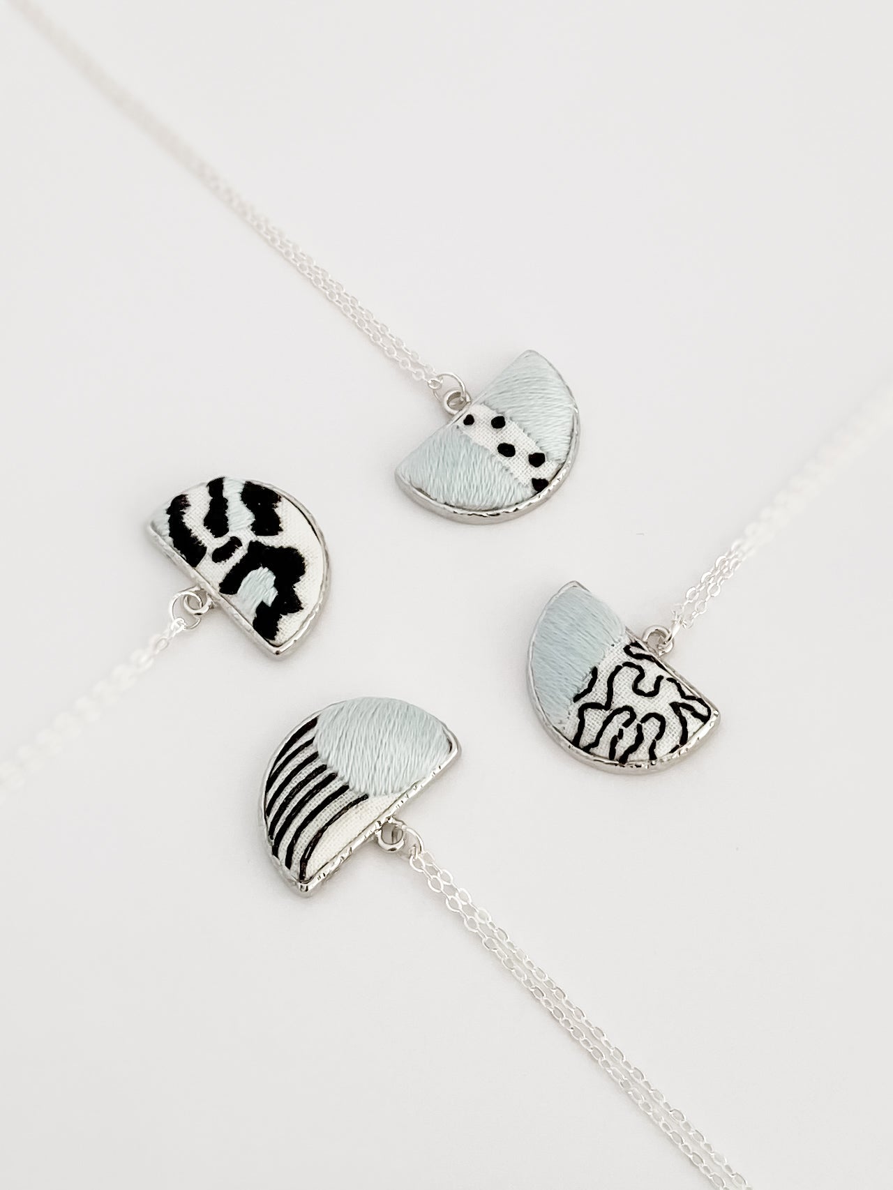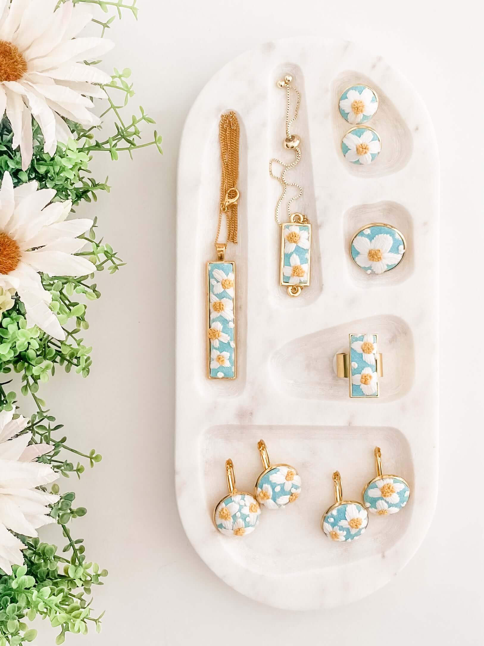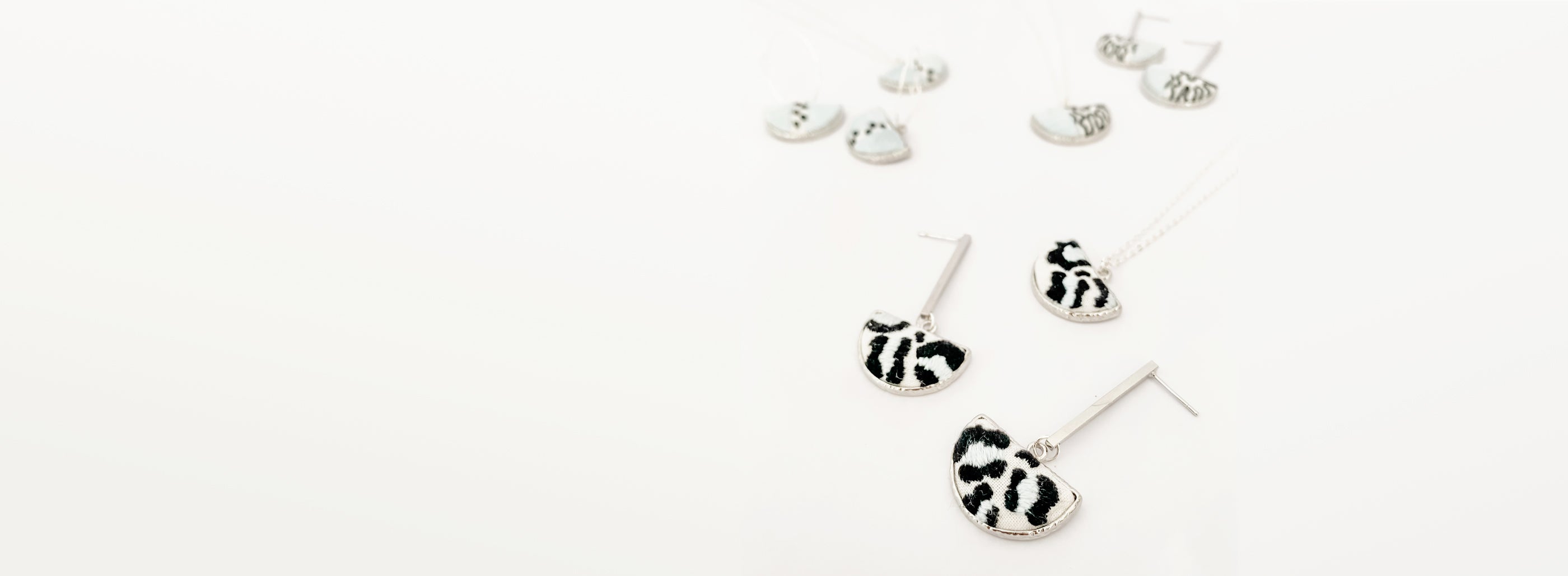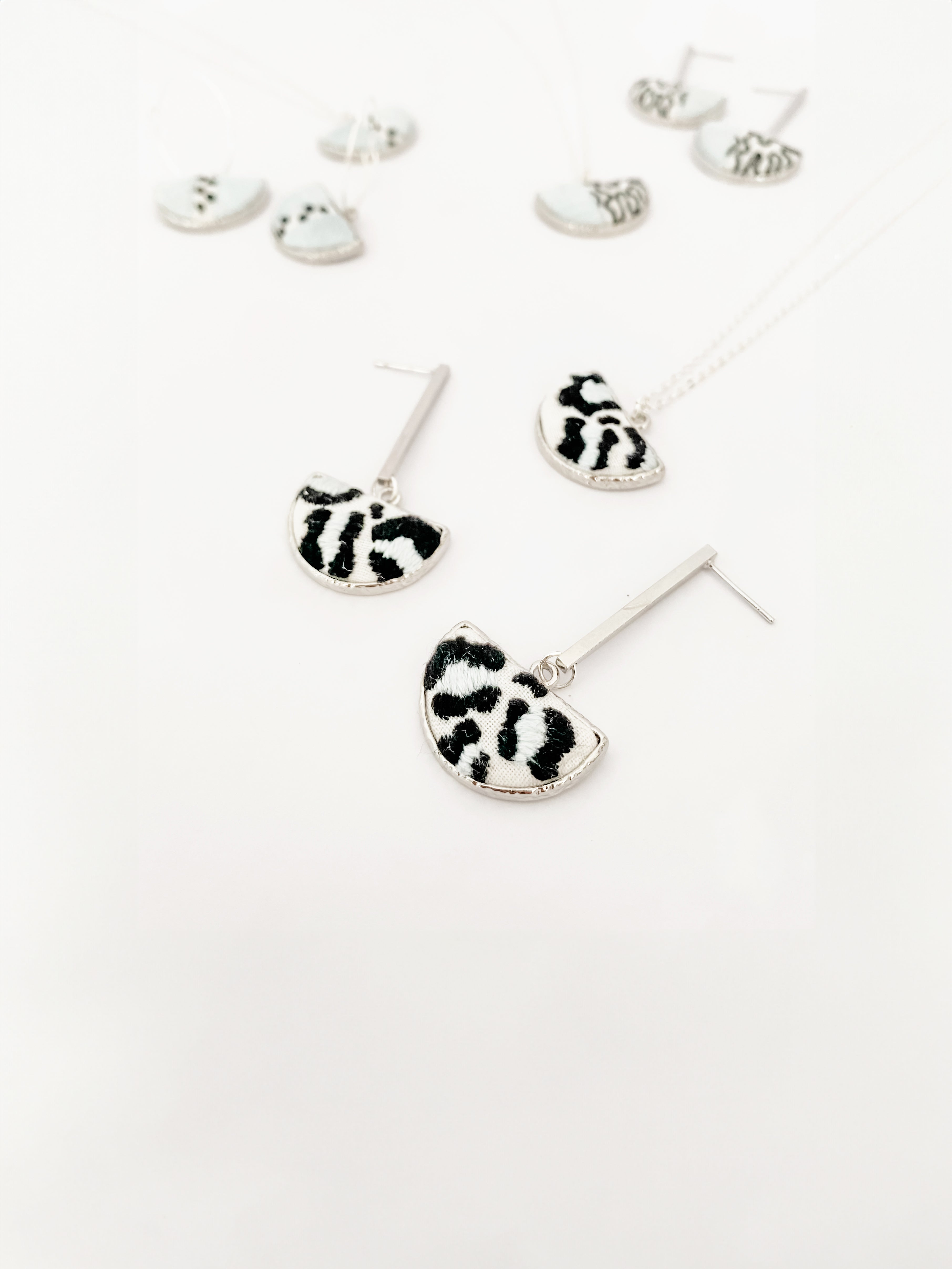 All jewellery is made with high-quality, lead- and nickel-free metal settings. Pieces are either gold- or silver-plated, depending on the collection, and embroidered with premium cotton threads on fabric backgrounds.